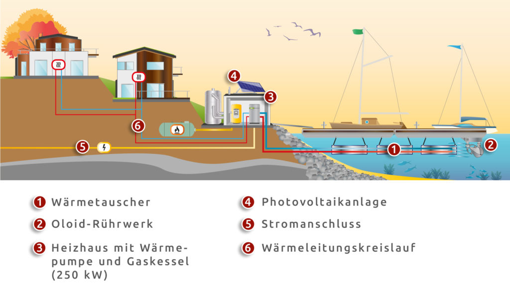 Das Feriendorf besteht aus 17 Gebäuden mit 34 Apartments, ergänzt durch ein Verwaltungsgebäude, Bootsgaragen, ein Wassersportzentrum sowie Cafés und Ladengeschäfte – insgesamt 4.400 m² beheizte Fläche. Zwei leistungsstarke Wärmepumpen mit je 78 kW versorgen die 29 Hausanschlüsse mit erneuerbarer Wärme. Zur Sicherstellung der Wärmeversorgung bei niedrigen Seetemperaturen im Winter dient ein Gasbrennwertkessel als Backup. Im Sommer können die Gebäude mit der gleichen Technologie effizient gekühlt werden.